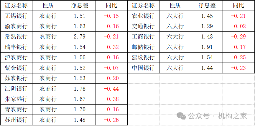 2024年6月末A股上市农商行与六大国有银行净息差情况一览