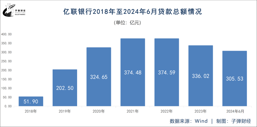 2021年,亿联银行贷款总额达最高点374.48亿元,此后便开始下滑,2022年和2023年分别为374.59亿元、336.02亿元。