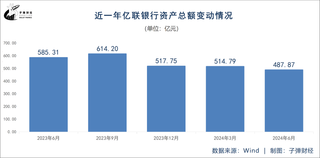 截至2024年6月末,亿联银行资产总额为487.87亿元,较年初减少29.88亿元。在2024年一季度末,亿联银行资产总额为514.79亿元,这就意味着,仅二季度亿联银行资产总额下降26.92亿元。