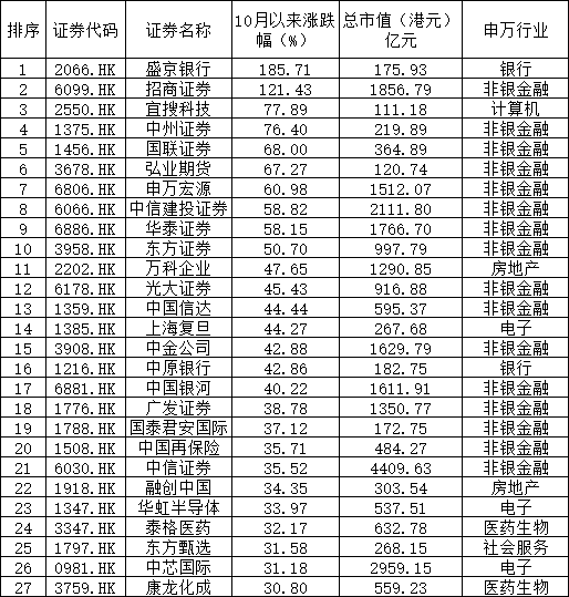 十月的三个交易日,招商证券、申万宏源、中信建投证券、华泰证券、中金公司、中信证券分别上涨了121.42%、60.97%、58.82%、58.14%、42.87%、35.52%。