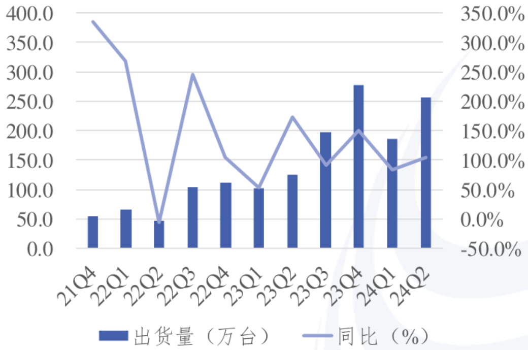 图:各季度我国折叠屏手机出货量(万台)及同比