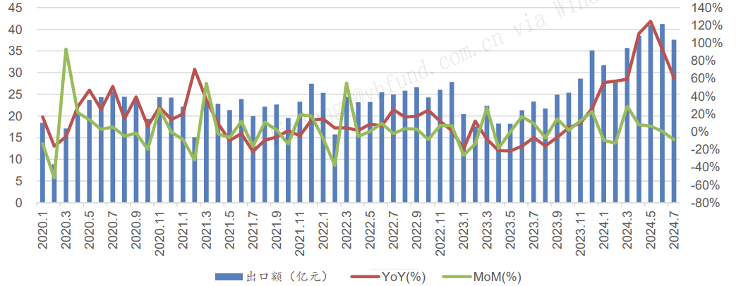 数据端,我国光模块企业今年以来出口表现亮眼。2024年1-7月,我国光模块出口总额达253.4亿元,同比大增79%。我国作为光模块生产大国,海关数据的高增长印证了AI驱动下的光模块行业高景气。