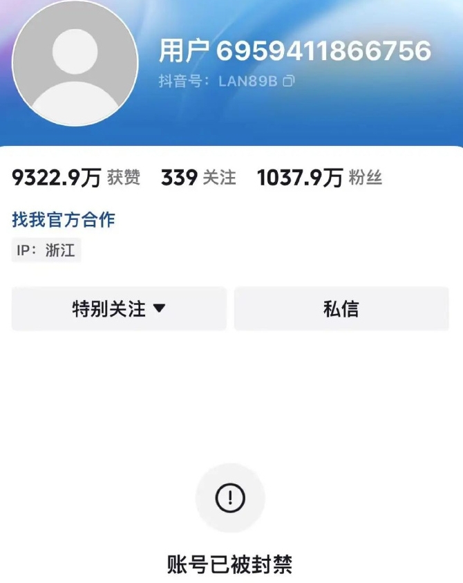 今日午间发现,千万粉丝博主大蓝抖音账号被封。