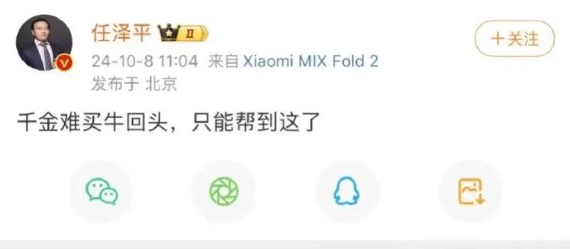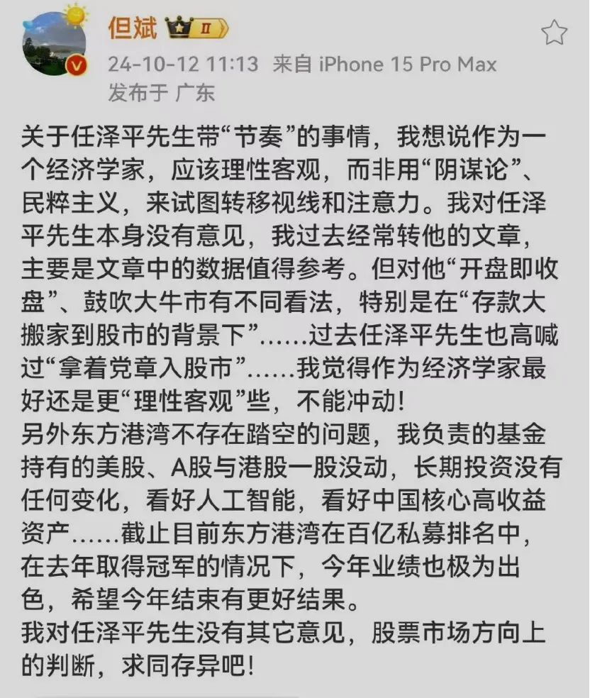 到了10月12日,但斌在微博发文,点名任泽平“带节奏”,他表示,作为一个经济学家,应该理性客观,而非用“阴谋论”、民粹主义,来试图转移视线和注意力。我对任泽平先生本身没有意见,我过去经常转他的文章,主要是文章中的数据值得参考。但对他“开盘即收盘”、鼓吹大牛市有不同看法,特别是在“存款大搬家到股市的背景下”……我觉得作为经济学家最好还是更“理性客观”些,不能冲动!