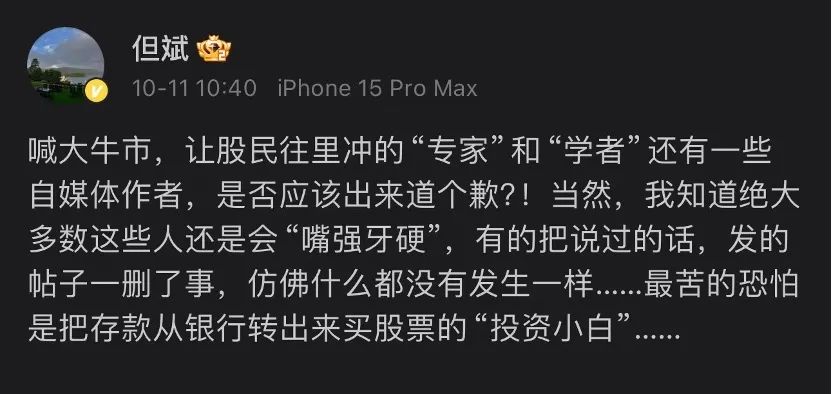 10月11日,但斌多次表态自己提示过风险之后,开始不知名的批评,:喊大牛市,让股民往里冲的“专家”和“学者”还有一些自媒体作者,是否应该出来道个歉?