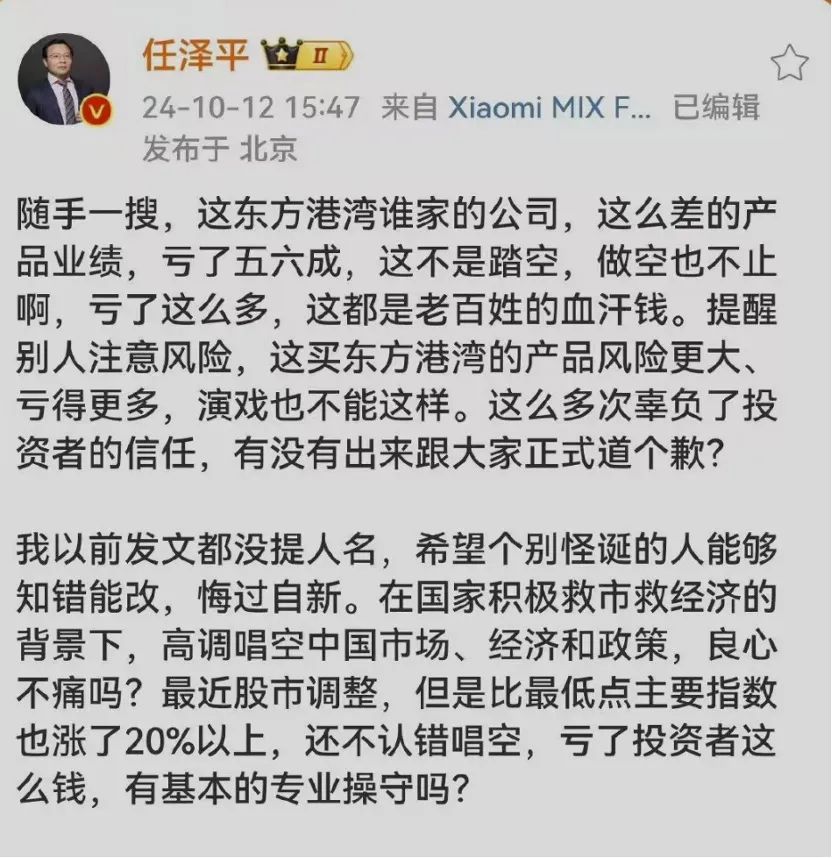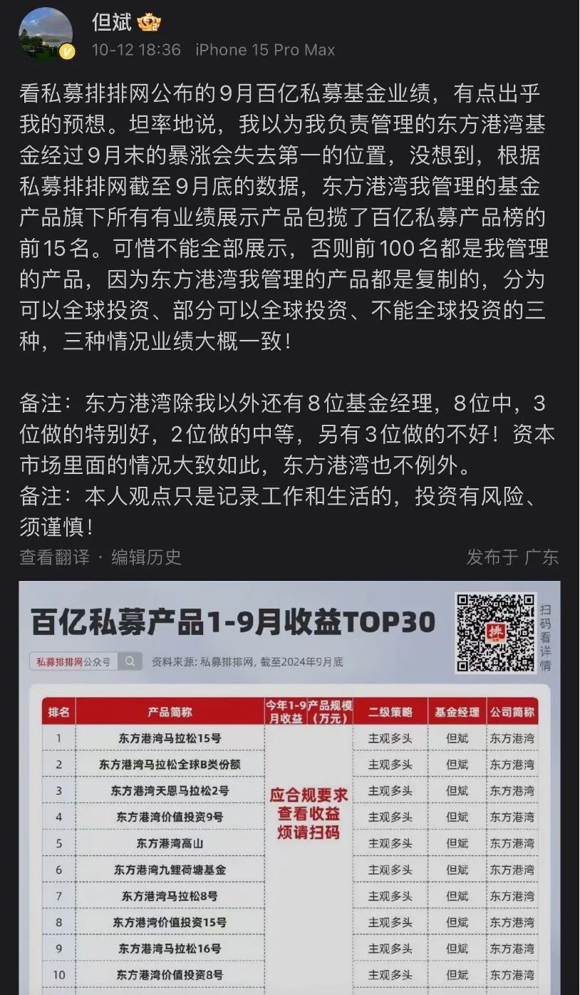 12日上午,但斌说东方港湾是去年百亿私募冠军,下午,任泽平说“随手一搜,这东方港湾谁家公司,这么差的业绩,亏了五六成……有没有出来跟大家正式道个歉?”