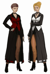 这两位也是《拳皇》系列的元老级角色了,最早登场于《拳皇94》。她们的真实身份是“大蛇”的手下“八杰集”的一员,因为要监视企图夺取大蛇一族黑暗之力的卢卡尔而成为他的秘书。在《拳皇96》的剧情中与八神庵一起参加拳皇比赛,但被大蛇之血所反噬的八神庵击倒后死亡。后来两人以亡灵形态于《拳皇13》中回归,并于《拳皇14》中完全复活。