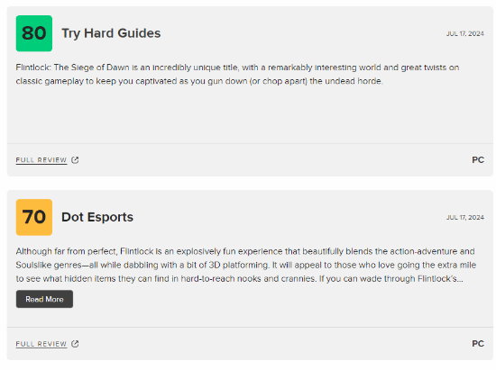 《燧石枪:黎明之围》已于今日正式发售,首发同步加入XGP。该作的M站评分也已解禁,目前媒体均分71分,收录17篇评测。5条好评,12篇中评。