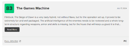 《燧石枪:黎明之围》是一款非常美味的大杂烩游戏,也不是没有缺点,但就操作设置而言,它是款有趣的游戏,而且卖相不错。敌人的AI值得商榷,关于武器、盔甲和技能的长期成长构建也有缺失。游戏剧情发展太快了,以至于让它像个“附录”。