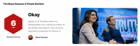 《黑袍纠察队》第四季最终集"Season Four Finale"现已上线,外媒IGN给该集打出了6分的评价。截止发稿,该季烂番茄新鲜度93%,观众爆米花指数52%。