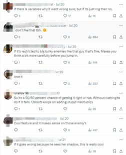 一位玩家怀疑,这只是单纯的随机事件,如果是这样,他并不赞成暗杀失败的设定。另一位玩家表示,没有人会喜欢失败的暗杀,如果可以的话,他一定会关闭该功能。大部分的玩家认同这一看法,他们认为暗杀失败的负反馈与玩家扮演刺客追求的爽感相违背。