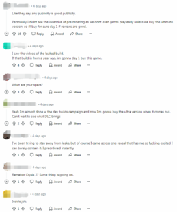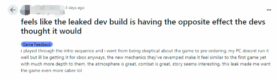 Reddit上有玩家发帖表示,他最初很担心游戏的质量,但看过泄露片段后反而放心了。还有很多玩家直言,自己在玩过了开发版后,直接预订了正式版游戏。