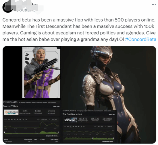 一位玩家对比了《第一后裔》和Beta版《星鸣特攻》的Steam玩家情况,前者在线峰值一度超过26万人,而后者最高时也只有2300人。“玩游戏是为了逃避现实,而不是被迫参加什么政治活动。给我一个性感的亚洲美女,别让我每天扮演一个老太婆。”