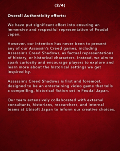 我们已经投入了很大的精力,以确保一个身临其境和尊重封建日本的代表。然而,我们从未打算在任何《刺客信条》游戏(包括《刺客信条:影》)里呈现真实的历史或历史人物。相反,我们的目标是激发好奇心,鼓励玩家探索和了解更多我们受到启发的历史背景。《刺客信条:影》首先被设计成一款有趣的电子游戏,讲述了一个以封建日本为背景的引人入胜的历史小说。我们的团队与外部顾问、历史学家、研究人员和育碧日本的内部团队广泛合作,为我们的创意选择提供信息。