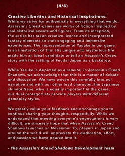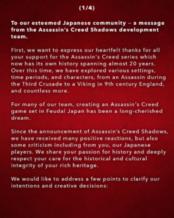 致我们尊敬的日本社区——来自《刺客信条:影》开发团队的声明: