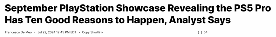 据外媒wccftech报道,游戏分析师William R. Aguilar近日在X列举了索尼能在9月的PlayStation发布会里公布PS5 Pro的十大理由,并表示自己有90%的把握认为索尼会在9月举行PlayStation发布会。