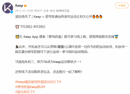 7月23日,Keep宣布将与米哈游《崩坏星穹铁道》正式联动,玩家在Keep App搜索“星穹铁道”即可参与线上跑,获取两款联名奖牌,活动时间为7月26日至9月26日。