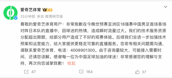爱奇艺体育官方发博道歉:非常抱歉在今晚世预赛亚洲区18强赛中国男足首场客场对阵日本队的直播中,因球迷的热情,造成瞬时流量过大。