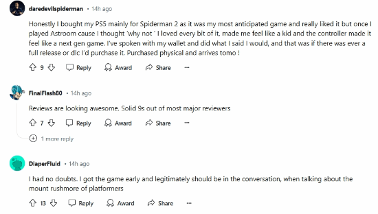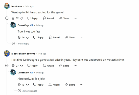 另外,还有玩家表示他知道这款游戏会很棒,但没想到这么棒:“我真的很震惊。我非常确定这款游戏会很棒,但94分使这款游戏的表现略胜于《最终幻想7:重生》和《超级马里奥:惊奇》等游戏。我原本预计会在85到90分左右。说实话,这款游戏对我来说是一种“等待评测”类的游戏,现在,评测结果表明我要购买。”