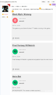 近日,有网友发现M站用户疑似存在刷分现象,有不少小号给《黑神话:悟空》打出0分,给《宇宙机器人》《最终幻想7:重生》满分。