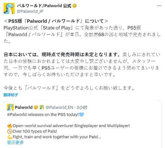开发商Pocketpair发公告表示:“游戏在日本的发售日期尚未确定,我们向期待本作的日本玩家表达歉意,所有工作人员会尽快努力将游戏带给各位PS5玩家。”