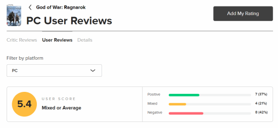 《战神:诸神黄昏》PC版M站玩家评分5.4分,目前仅有19名用户参与了评分,其中7位用户给出好评,4位玩家给出中评,8位玩家给出差评。