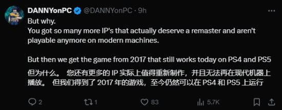玩家表示,这完全是浪费开发资源,《神秘海域1/2》应该得到这种待遇;他们有很多IP值得重制,而且那些都不能在现代主机上玩了。这款2017年的游戏还能在PS4/5上运行。