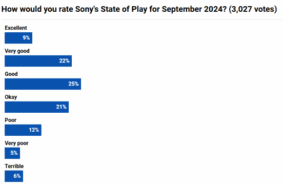 外媒Push Square发起了新一轮满意度投票调查,截至发稿,共有3027名玩家参与投票,9%玩家认为出色,22%的玩家认为非常棒,25%的玩家不错,21%的玩家表示还可以。得益于《羊蹄山之魂》的公布,玩家们反响还算不错。