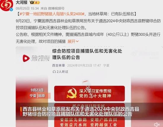 25日,西吉县林业和草原局一名工作人员告诉大河报·豫视频《看见》记者本次捕猎不能用枪,也不能下毒。其称,上述公告已经发布了2天,目前已经有队伍进行了报名。