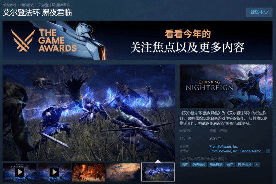 在今日的TGA 2024里,FromSoftware公开了《艾尔登法环:黑夜君临》,游戏为多人合作玩法,将于2025年正式发售,Steam商店页面一并上线。