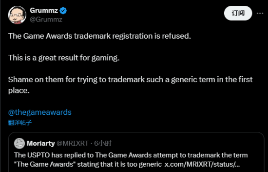 目前,TGA的商标申请已被驳回。美国专利商标局给出的答复是商标名太过于笼统,博主Grummz称TGA试图将通用术语注册为商标的行为太可耻了。