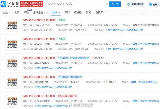 根据微博@新浪科技的消息称,企查查APP显示,《鹅鸭杀》出品方GAGGLE STUDIOS INC.(鹅群工作室股份有限公司)曾申请注册多枚“GOOSE GOOSE DUCK”商标,分类包括教育娱乐、科学仪器等,目前部分商标已成功注册。