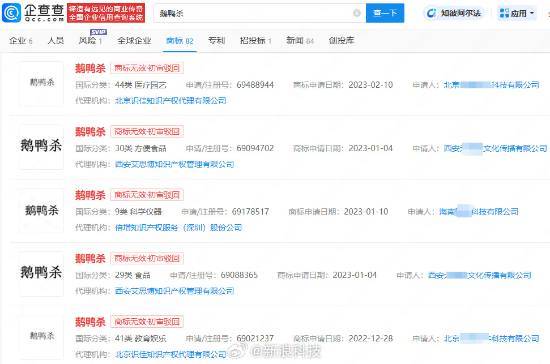 此外,企查查上还显示“鹅鸭杀”商标已被多方抢注,目前部分商标已被驳回。