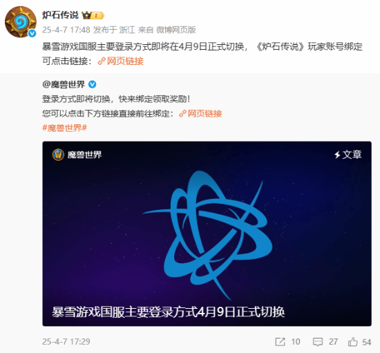 今日,《炉石传说》等暴雪游戏官方账号发文,国服主要登录方式即将在4月9日正式切换!